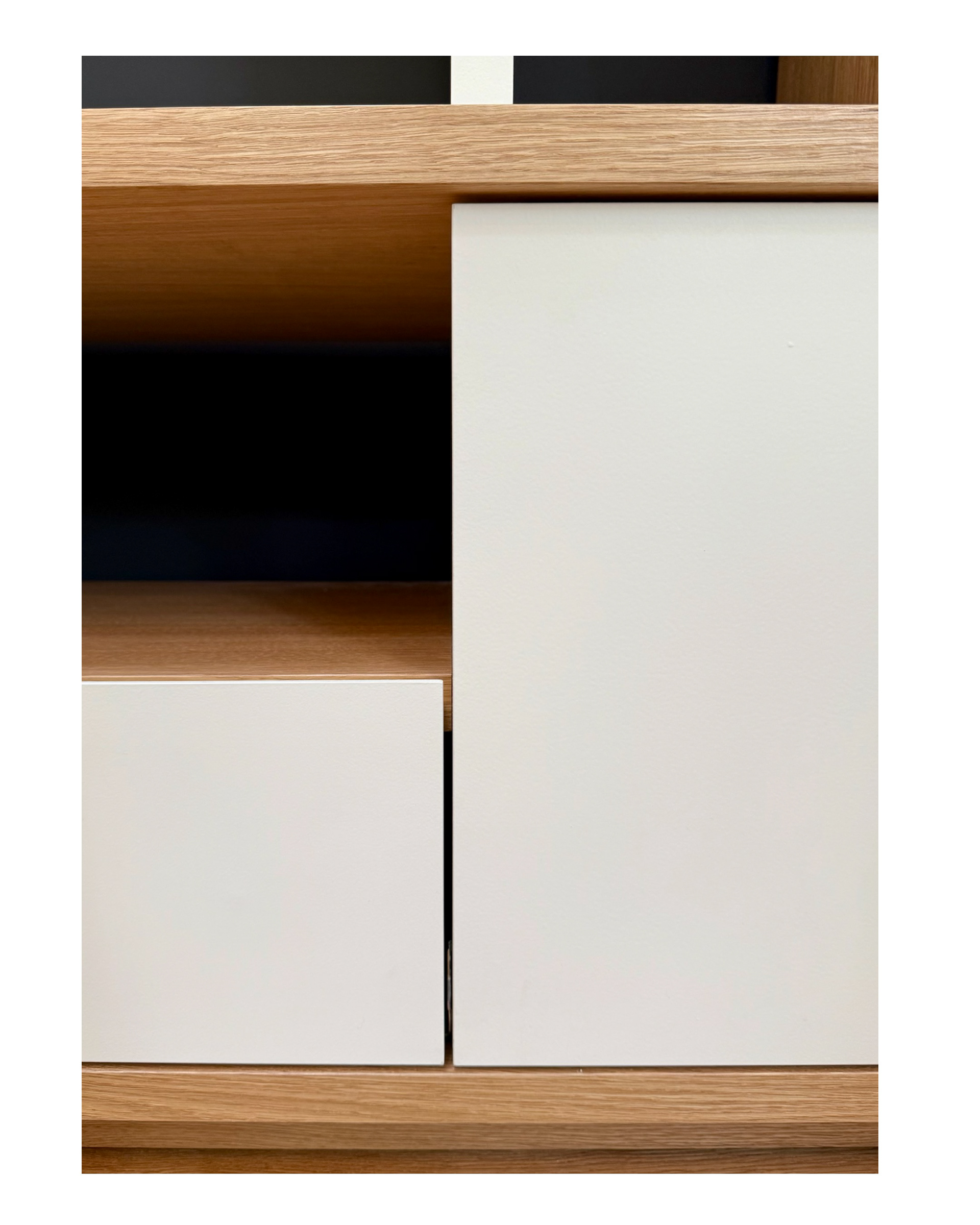 Meuble bureau, espace TV et rangement en panneaux plaqués frêne, frêne massif et bois peint, Beersel