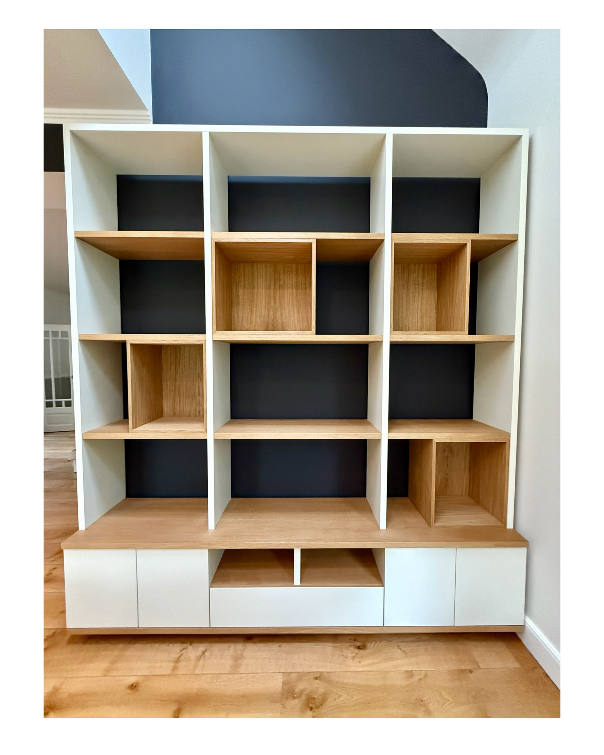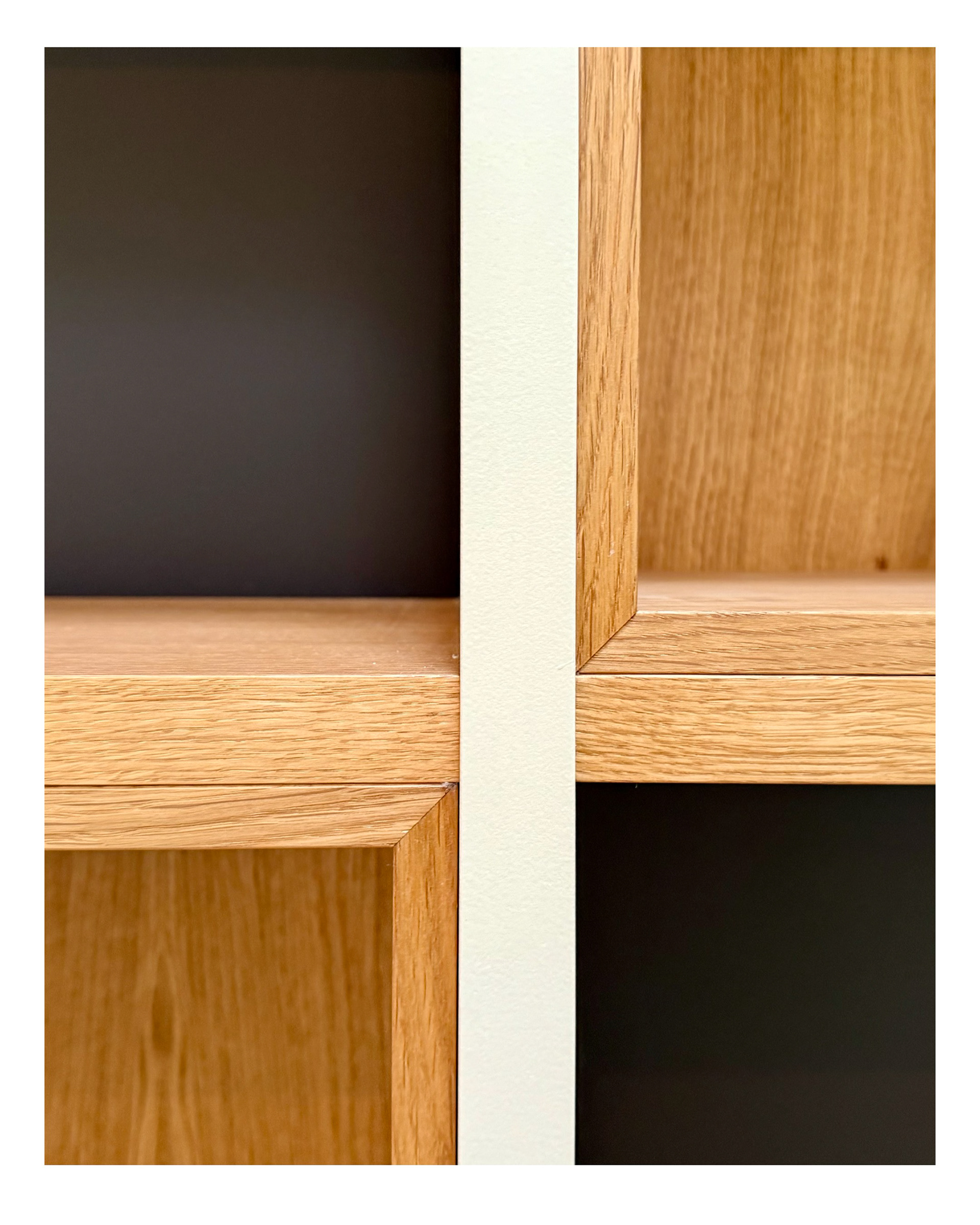 Bibliothèque en panneaux plaqués chêne et bois peint, Beersel