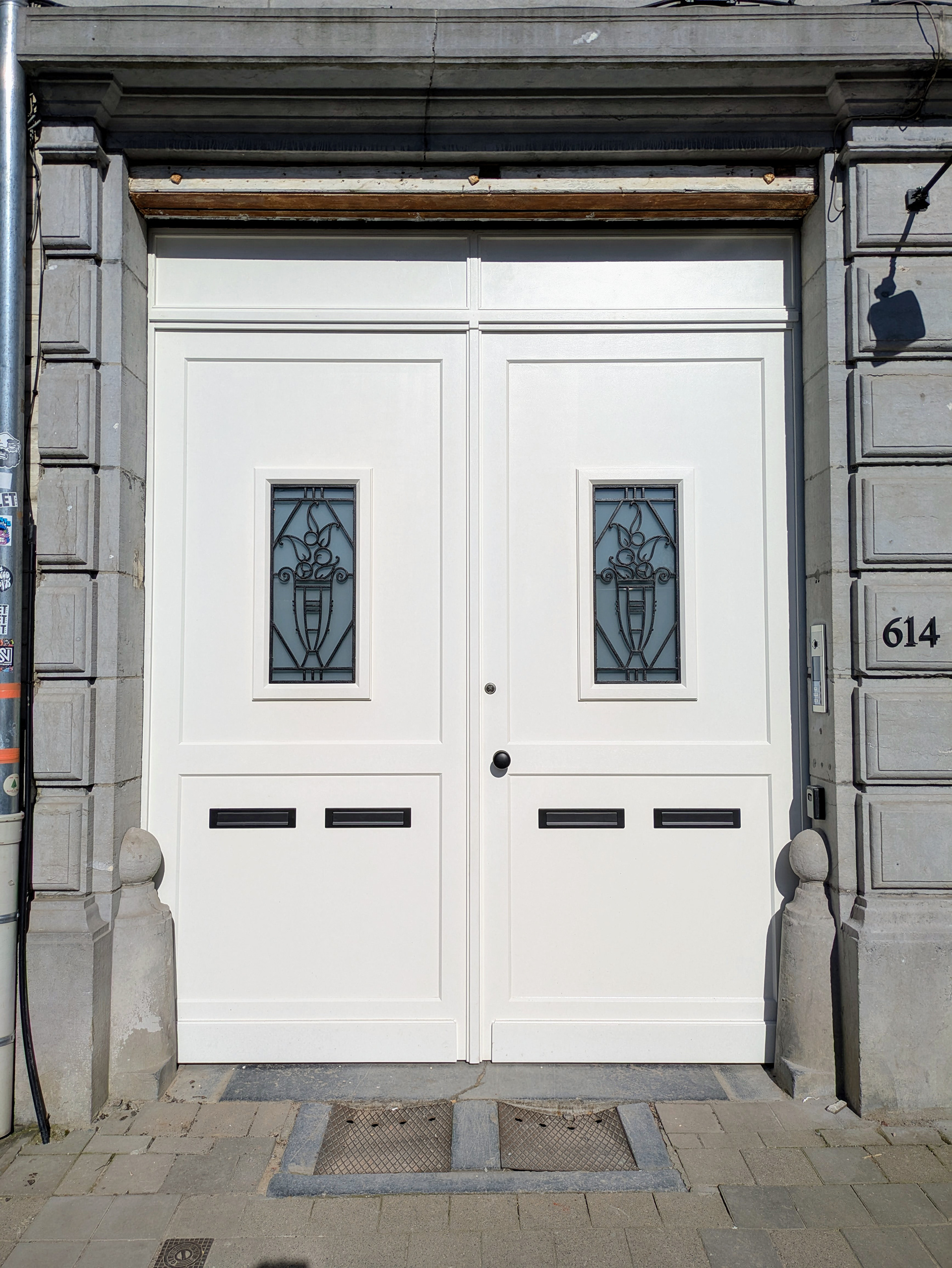 Double porte cochère et imposte en chêne massif et panneaux d'okoumé, Ixelles